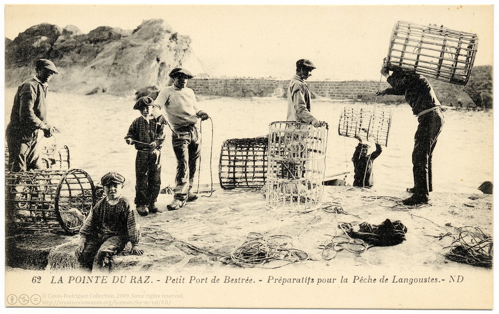 Lobster Fishing In Brittany (c.1910). Petit Port de Bestrée. - Préparatifs pour la Pêche de Langoustes. Preparations for Spiny lobster fishing. Vintage photographic postcard, c.1910 Published by Lévy et Neurdein Réunis (originally by Neurdein frères), Paris, France. © Casas-Rodríguez Collection, 2009